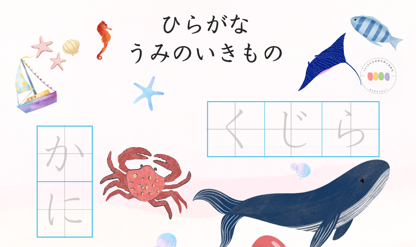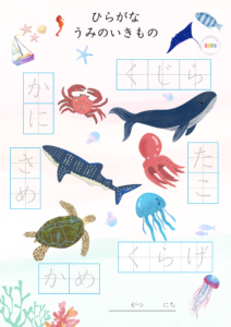 ひらがな練習【いきもの編】 for kids 2026.01.16 【うみのいきもの編🐳】 【どうぶつ編🐰】 ▶︎PDFダウンロード 6種類の海の生き物と、5種類のどうぶつを、ひらがなで練習できます✏️ くじら・かに・たこ・さめ・くらげ・かめ ぱんだ・うさぎ・ぞう・とら・ぶた
