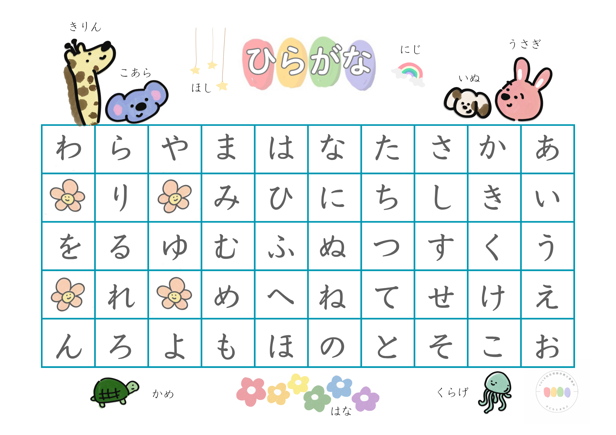 ひらがな for kids 2025.10.23 やさしい色合いで、ゆるい雰囲気の動物たちが描かれたひらがな表を作成しました。 どちらもA4サイズのPDFですので印刷してお使いください。 (それぞれ、画像をクリックするとPDFデータがひらきます。) ひらがな表↓ なぞり書き用↓